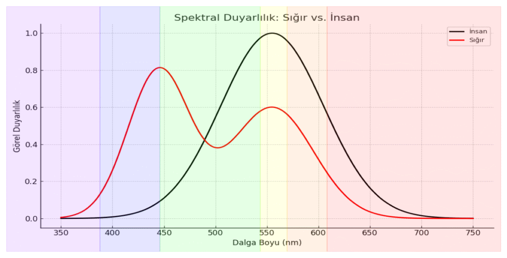İneklerin göz yapısı insanlardan farklıdır ve spektruma duyarlılıkları da farklılık gösterir. İnsan gözüne uygun aydınlatma, hayvanlarda stres yaratırken, ineklerin görsel konforuna uygun özel dalga boylarıyla tasarlanan aydınlatma sistemleri daha olumlu davranışlar ve daha iyi yem tüketimi sağlar.